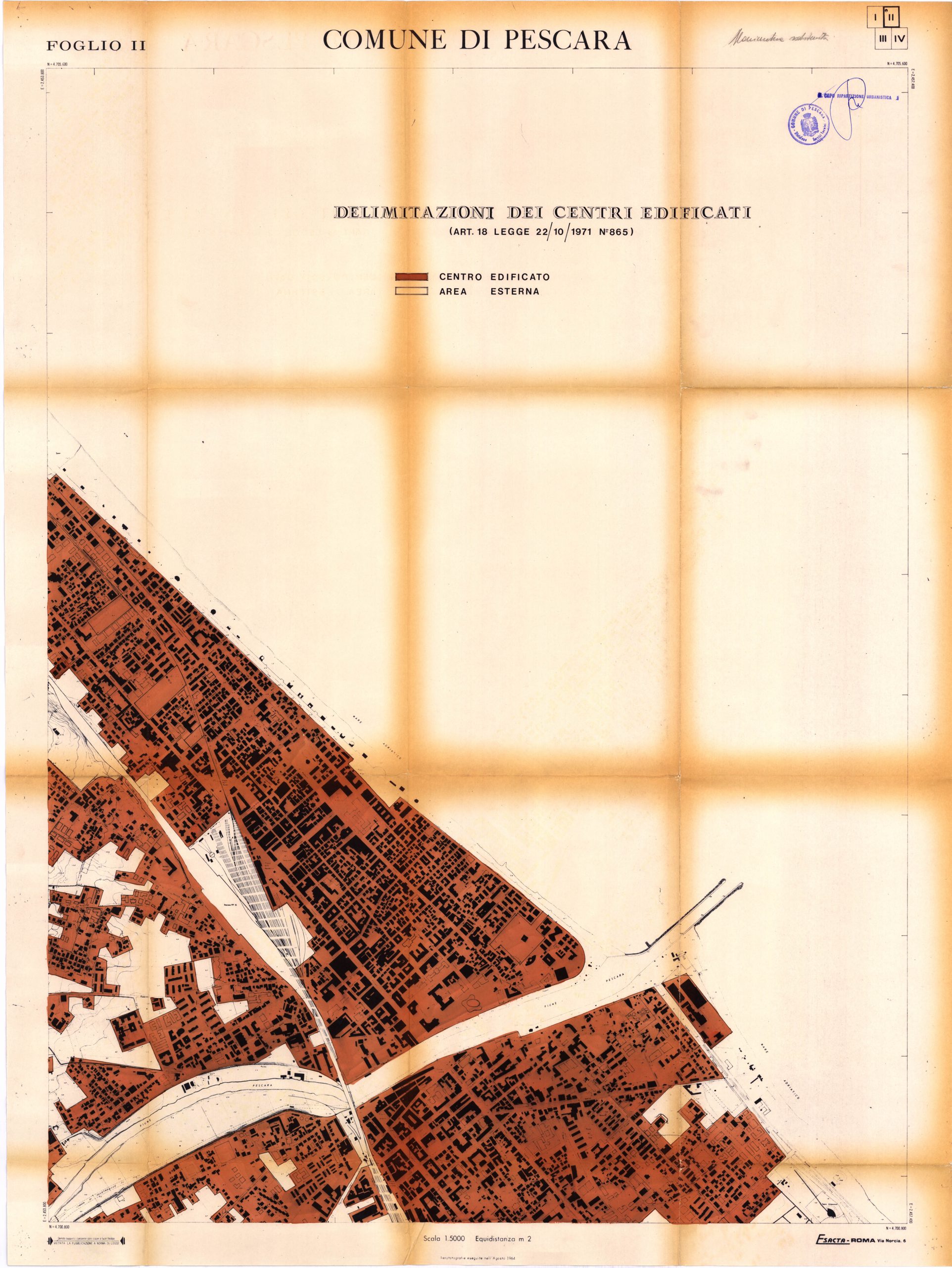 Il “centro edificato” di Pescara a quella data è individuato dalla delibera di C.C. n. 38 dell’8 luglio 1972 di approvazione delle “delimitazione dei centri edificati” (art. 18 L. 865/71):