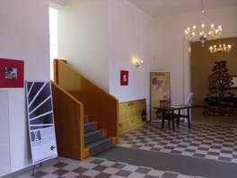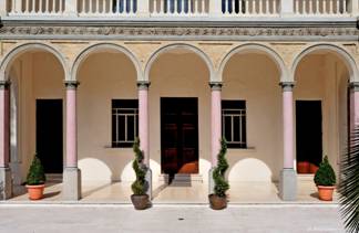 Dopo aver attraversato il viale d’ingresso si giunge al di sotto del doppio loggiato che caratterizza la facciata dell’ex kursaal. È il punto di vista che consente di ammirare in particolare gli splendidi colori dell’architettura, che variano dal giallo al rosa in un gioco di sfumature che accendono le forme di un’elegante luce.