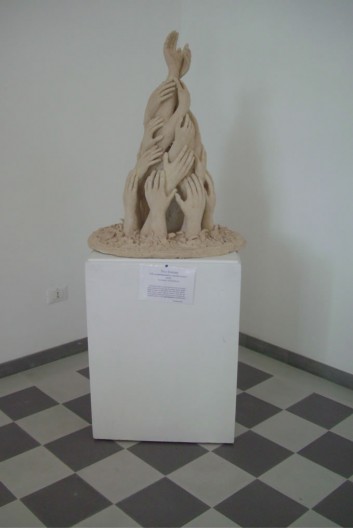 Dall’entrata principale si accede all’ingresso dell’Aurum: un ampio spazio destinato all’accoglienza dei visitatori, impreziosito da importanti opere donate da artisti contemporanei: la creazione di Pino Dolente, “Oh animanimanima mediterranea”, realizzata nel 2009. La scultura è in terracotta e rappresenta un gruppo di mani che tende verso l’alto, in un in movimento elicoidale che crea tensione: le mani tese verso il cielo, alla ricerca di un appiglio, una speranza di rinascita. Il nome stesso dell’opera intreccia le parole anima/mani e penetra nello spazio dolcemente, sottovoce; una realizzazione di Marco Mazzei: questa volta si tratta di uno dei suoi famosi specchi, chiamato Ondate, un richiamo forte alla sua città e al suo mare, realizzato con la tecnica dello sbalzo, in alluminio. Sempre nell’ingresso si trova l’opera di Anna Seccia “L’uovo della creatività collettiva”, creata insieme agli studenti del Liceo Artistico Bellisario Misticoni di Pescara. Un’opera formata in realtà da una serie di singole istallazioni che si fondono tra loro. Oggi all’Aurum è conservata solo la parte centrale, la più importante, che diventa portavoce di un messaggio di solidarietà, veicolata attraverso l’arte. L’opera, presentata alla Biennale di Venezia, rappresenta una spirale che si sviluppa verso l’alto, nello spazio, quasi a formare le linee guida della rappresentazione di un grande albero. Sulla spirale si dispiega una fila continua di uova in polistirolo, tutte differenti nella decorazione. Importante è la simbologia delle forme utilizzate, legate al sentimento di rinascita e di cambiamento continuo.