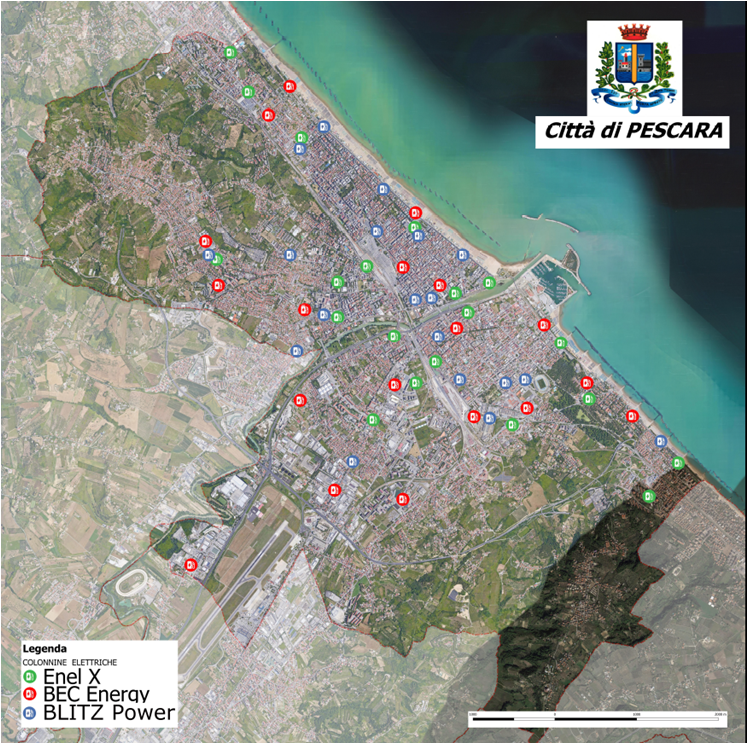 Il Comune di Pescara ha approvato 3 protocolli di intesa con altrettante Società (Enel Energia Spa, Be Charge Srl, Blitz Power) per installare sul territorio comunale 47 infrastrutture per la ricarica di veicoli alimentati ad energia elettrica. Le postazioni di ricarica sono disponibili e accessibili all’utenza H24 per tutti i giorni della settimana e sono dislocate in modo da non sovrapporsi le une alle altre e consentire una migliore copertura dei servizi di ricarica all’interno dell’area urbana.