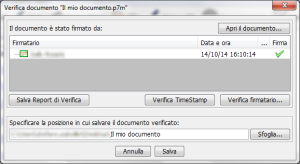 2. seleziona il file firmato digitalmente da verificare. In automatico, il software controllerà la validità della firma apposta e ti metterà a disposizione tutte le informazioni sul dispositivo di firma utilizzato: la Certification Authority emittente, il suo intestatario, la sua scadenza, ecc. Per consultare il documento originale puoi utilizzare il bottone in alto a destra Apri il documento.