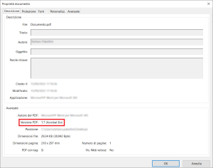 Per verificare la versione di un PDF devi semplicemente aprire il file con Adobe Reader e cliccare sulla voce File > Proprietà nel menu in alto a sinistra. Potrai consultare la versione nel campo Versione del PDF.