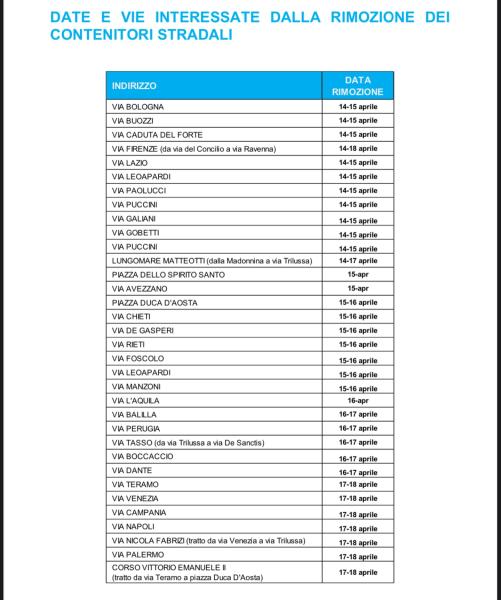 Dal 14 al 18 aprile 2025 verranno rimossi i cassonetti stradali nell’area “C3” del centro di Pescara, dove partirà ufficialmente la raccolta porta a porta. Contestualmente verranno installate le campane per il vetro, e la distribuzione dei kit per la racc