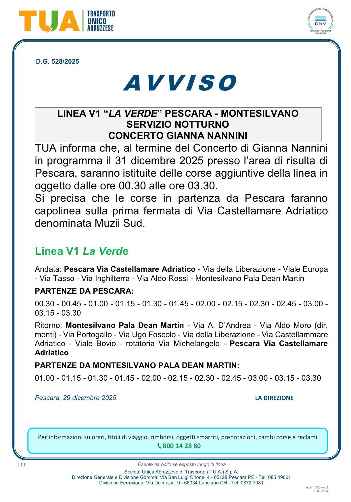 - Per il concerto di Gianna Nannini, la filovia (servizio della linea V1 - La Verde Pescara-Montesilvano) funzionerà regolarmente fino alle 21:15 del 31 dicembre per poi riprendere dalle 00:30 alle 3:30 del 1 gennaio 2026. Per il concerto si Irama la filovia funzionerà fino alle ore 23:00.