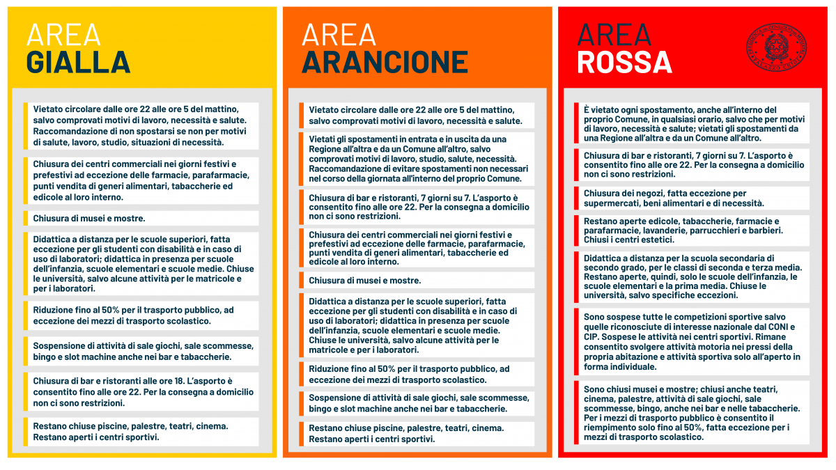 Il Provvedimento mantiene la diversificazione delle restrizioni, già adottata dal Dpcm 3 novembre 2020, nelle tre aree gialla, arancione e rossa, corrispondenti ai differenti livelli di criticità nelle Regioni del Paese.